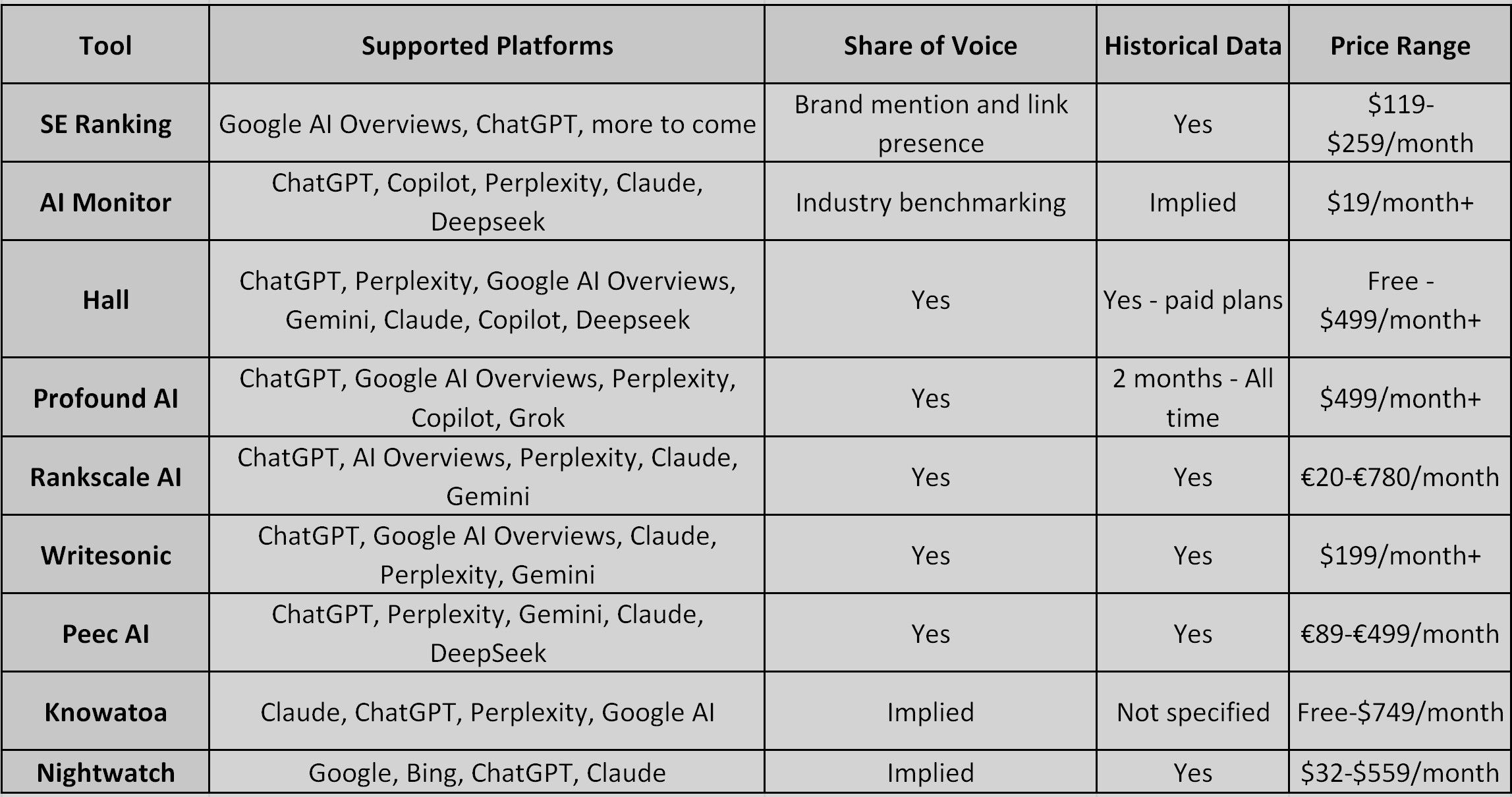 - Multi-platform coverage including ChatGPT, Perplexity, Google AI Overviews, Gemini, Claude, Copilot, and DeepSeek