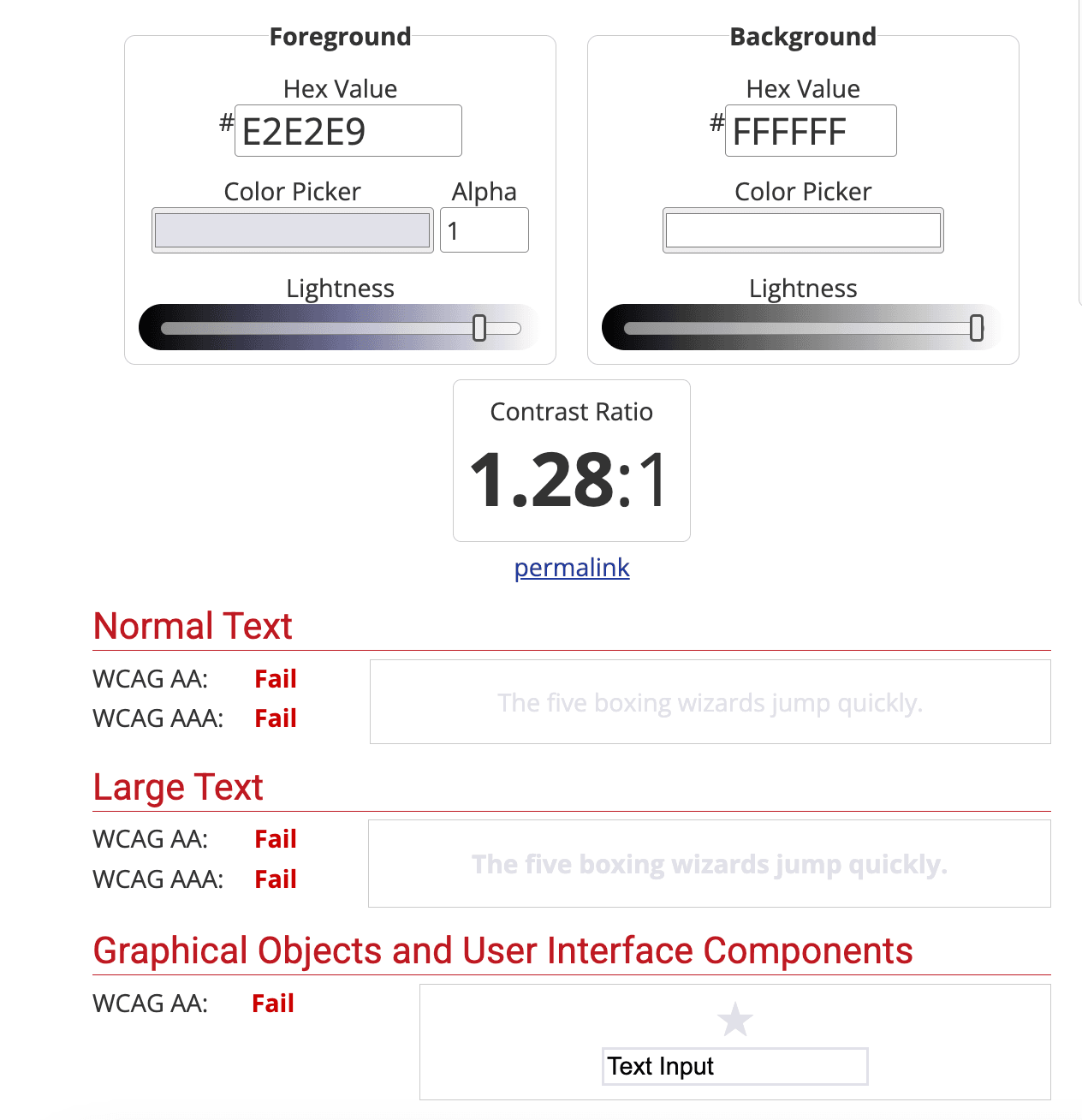 The screenshot below shows a foreground color of E2E2E9, which is light gray and background color of FFFFFF, which is white. The foreground and background color have a contrast ratio of 1.28:1, which does not pass WCAG AA or AAA standards.