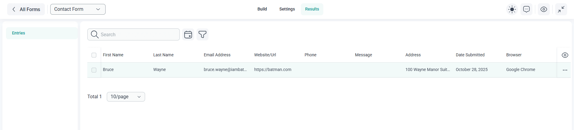 This data can also be accessed from Entries at the top of the plugin as well as under the Results tab within the form builder. By visually marking unread entries, you can easily keep track of new submissions and make sure you don’t overlook them.