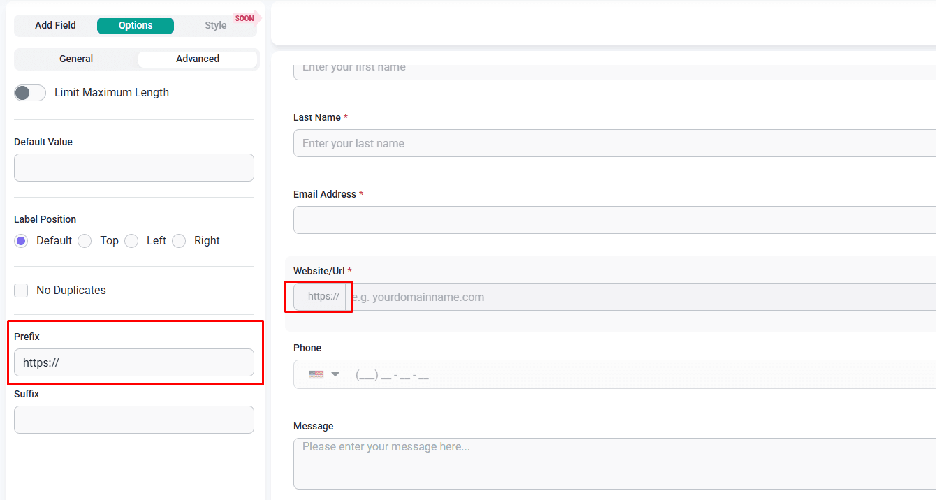 For example, when you click into the Advanced tab of the Website/Url field, you’ll find an option to add a Prefix.