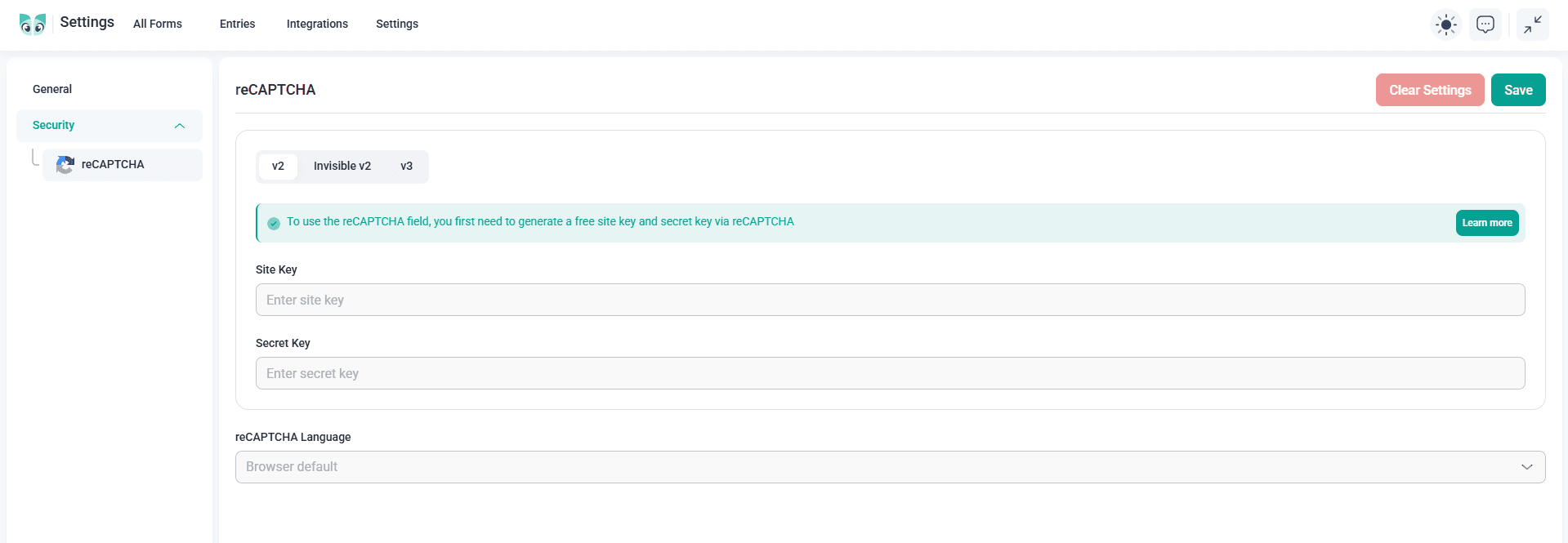 Go to Settings from the dashboard. Then enter your Site and Secret Keys. Once configured, you can add a reCAPTCHA to each form with just one click.