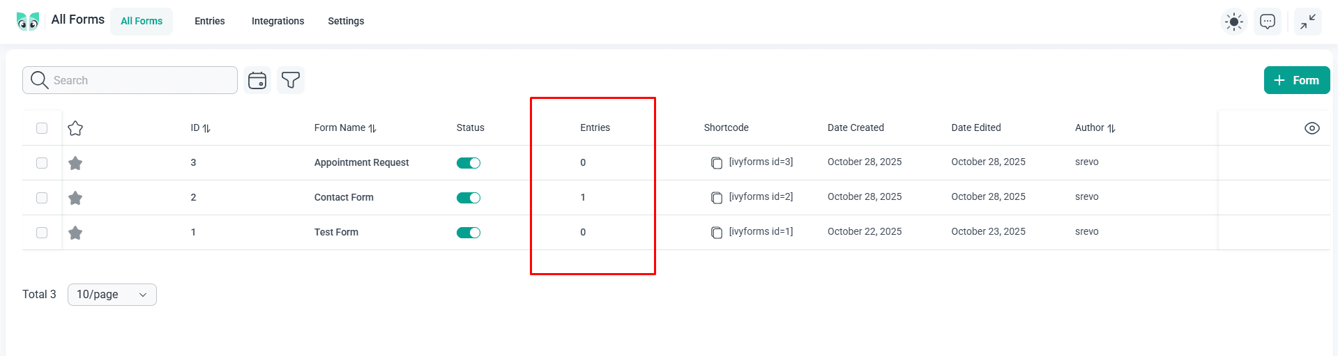 There are a number of places where this data is stored in the plugin. The first is in the main All Forms dashboard.