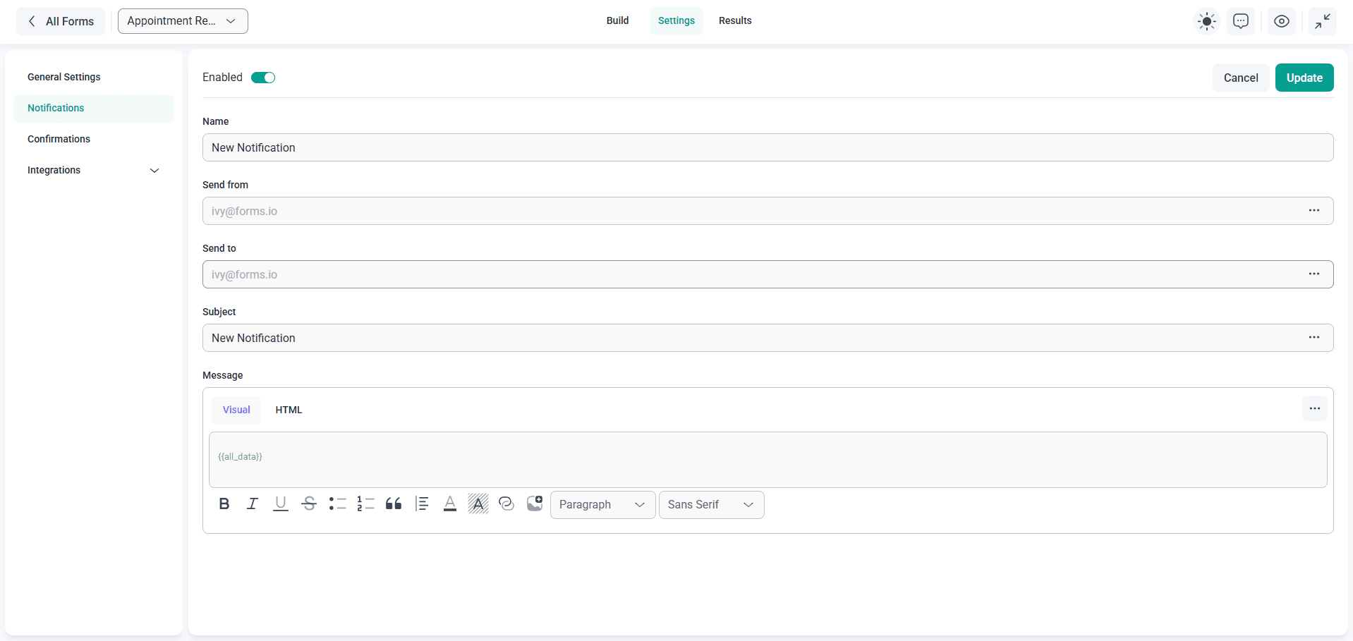 The development team behind IvyForms is currently working on building out a select collection of automations. At the moment, you’ll have access to simple templates to streamline setup as well as pre-written email notifications when someone fills out your forms.
