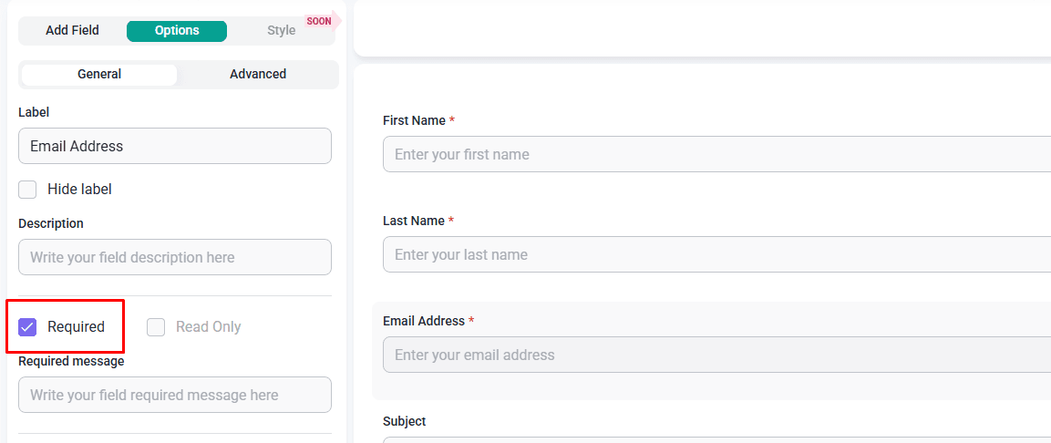 With the General and Advanced settings in the left control panel, you’ll have access to a variety of error prevention controls. For starters, every field includes the option to make it Required.