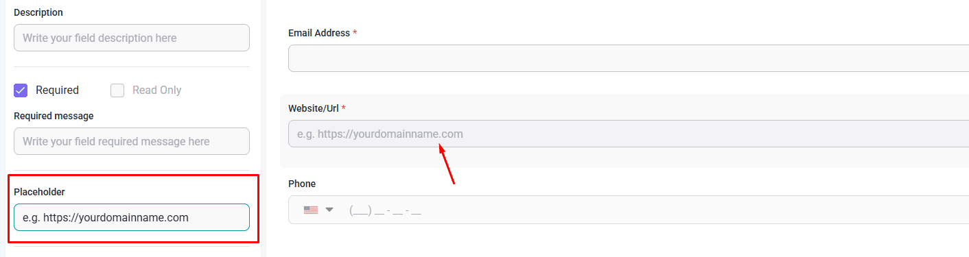 These settings allow you to add notes and tips to help users fully and completely fill out your forms. In the screenshot above, the placeholder text provides an example of the domain name format we’d like to see (e.g. https://yourdomainname.com).