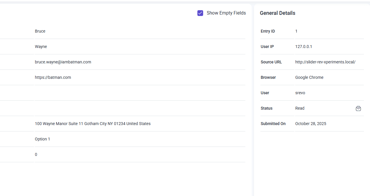 When you select an entry, you can gather extra details about the user, like their IP address, user name (if logged in), source URL (if the form appears on multiple pages), and browser type.