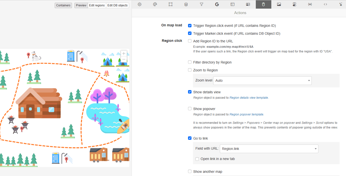For example, when someone clicks on a Region or a Marker, you can set the map to: