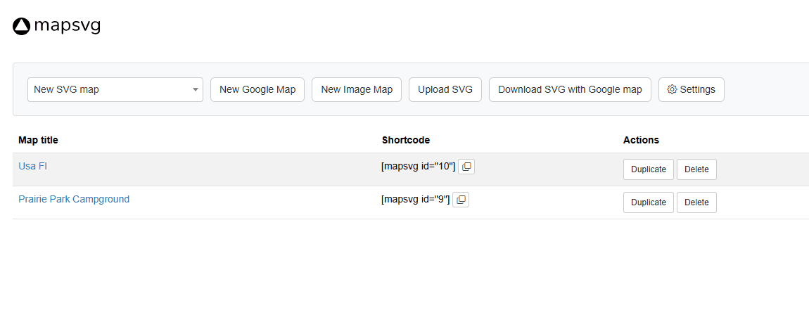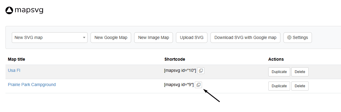 To add your map to a page or post, copy the shortcode. You’ll find it next to the name of your map in the top-left corner of the editor. The shortcode can also be found on the MapSVG dashboard.