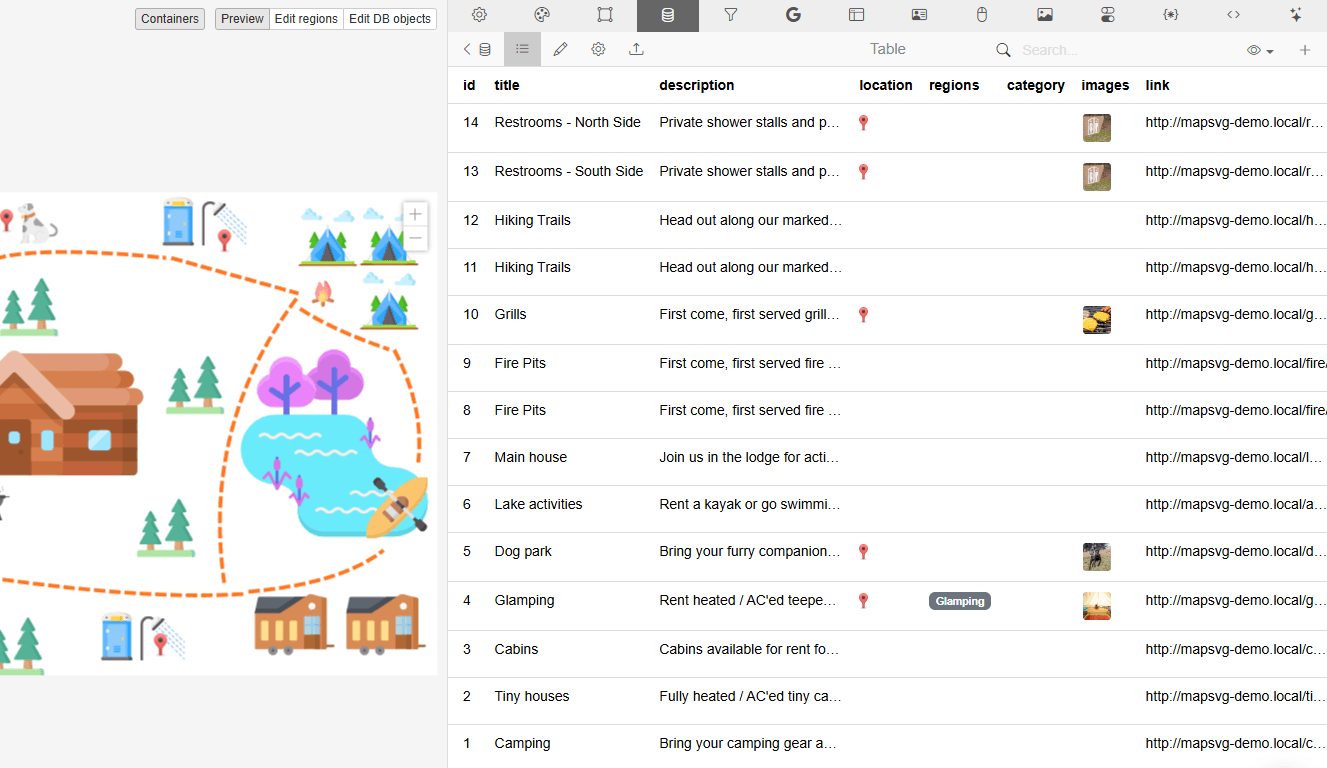 MapSVG’s built-in database lets you add/edit custom fields for Regions and Objects directly.