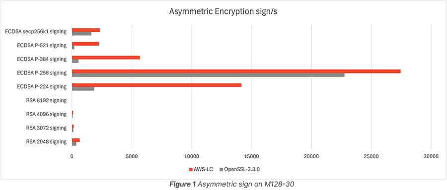 Figure 1 and Figure 2 show AWS-LC can provide better performance for both RSA and ECDSA signing and verifying.